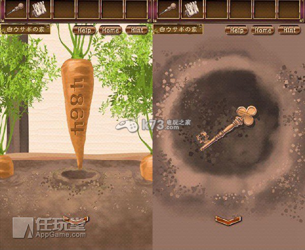 向右移动后,见到“白兔的家”的庭院,调查画面右方的胡萝卜田。