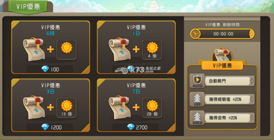 游戏裡有VIP优惠可以购买,只是这些都是有时间限制,好处是没有一定要花钱,如果解任务和关卡累积到一定的钻石,也可以拿来买。