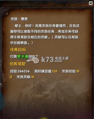宗派悬赏20级就能接,在宗派驻地的司融(0,-118)处接取,每天可以完成一次,任务内容是杀100只怪,必须组队才能领取。不同等级阶段的玩家接到的任务不一样,因此比如20+和30+的玩家最好不要一起做这个任务。同等级阶段每个人看到的任务也是随机的,因此建议让队伍里任务比较简单的那个玩家去接,这样大家都是接的比较容易完成的那个。