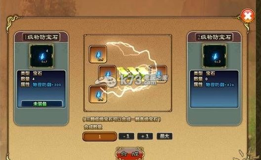 3颗同样种类的低级宝石可以合成一颗高级宝石(类别不变),合成百分之百成功。高级宝石和低级宝石都消耗1个宝石佩戴位置,但高级宝石所附加的能力更强大。在右侧菜单中点击“道具”按钮可以打开背包,点击宝石可以看到合成选项,进入合成界面。需要有3个同样级别和种类的宝石才可以进行合成。