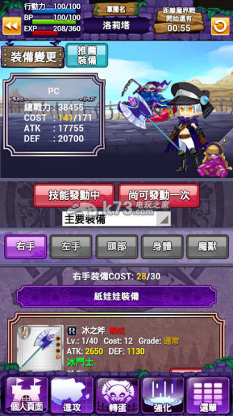 利用装备跟魔兽可以增加自己的ATK & DEF,装备分成五种〈左手、右手、头部、身体、魔兽〉,特色在于装备有COST限制,每个部位都单独计算,每件装备所耗的COST也不同,装备等级越高所耗的COST越多,因此,得利用角色升级时所赠的COST来作补充 (3点COST/ LV),金色、银色的装备(or魔灵)能力比一般还OP,所以得靠运气去抽转蛋机〈待会会介绍〉来提升自己能力。