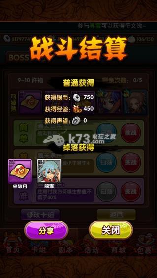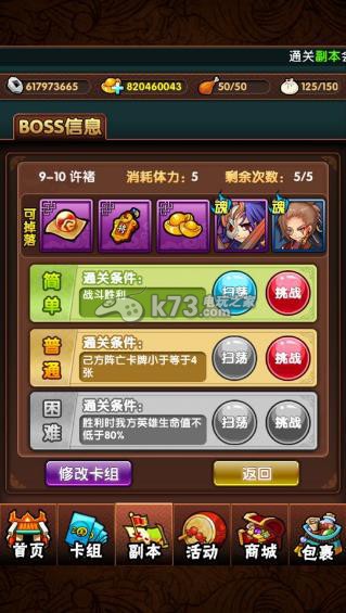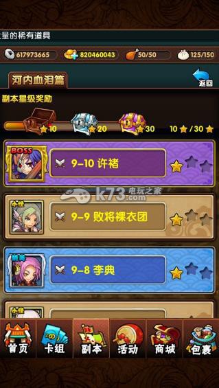 《三国大宝剑》的副本每个大关都有多个小关,从第五大关开始,每个大关都有10个小关,每个小关都有简单、普通、困难三个等级。当您成功完成一个等级的小关后就可以获得一枚星星,当星星达到10,20,30时可分别领取星级奖励。