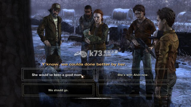 step11.心已乱作一团的简也答应了克莱蒙谭的请求再次加入DOA队伍之中,卢克与邦妮都知道李碧佳尸变,因此他们认同克莱蒙谭之前的开枪决定,是克莱蒙谭拯救了李碧佳的婴儿,然而这也难掩克莱蒙谭的愧疚。选项:①.她(李碧佳)会是一名好母亲…;②.她(李碧佳)现在与埃尔文在一起了;③.我们应该马上起程;④.沉默。