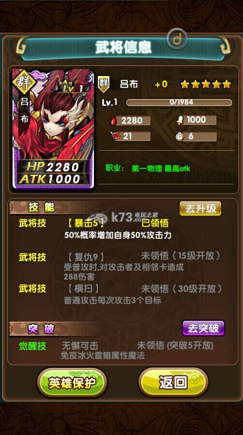 本来就被称为三国第一的男人,绝对的物理输出第一,1级就拥有1000的初始攻击力,还拥有最高的武力成长。暴击虽然只有5,但是横扫一次三刀有木有!这都不算什么,其实最恶心的是他的觉醒技,免疫冰火雷暗属性魔法,敢问现在的魔法除了这四个属性外还有什么输出魔法么,木有!也就是说相当于魔法免疫!我晕死!相当于只能拿物理和毒去和吕布对拼,但是,最强拿物理输出和吕布对拼?您一定想多了!