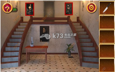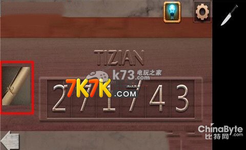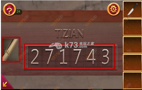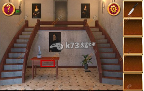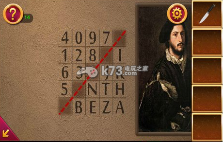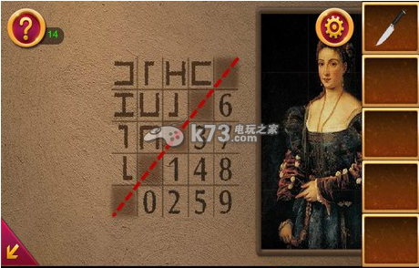 5.然后用小刀将正中间的画切开,后面一个密码箱,输入密码如下图,拿到钥匙,本关成功脱出。