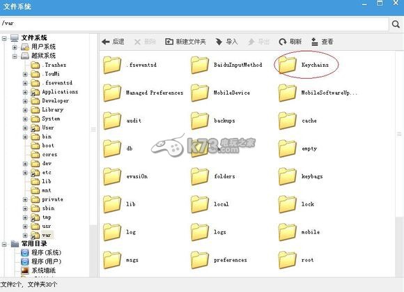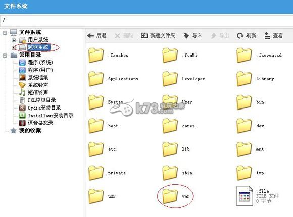 第二步,左侧选择“越狱系统”,从右侧打开“var”文件夹