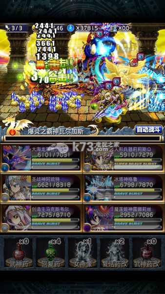 开局,对面有谁我都忘了,4个火系的,其中有火锅妹兰西亚,锁定她,然后创妹海龙冰塔磕武神药,然后挂自动。。。。第二图也是挂自动。。。第三图。。。我能说也是挂自动么?好吧,满sbb进入第三图,打一波,冰塔没满bb,磕武神,第二波的时候,冰塔bb就放,其他没满sbb就普通攻击,然后保证每回合冰塔至少有bb就行了。。。当中有一波被打的挺惨,所以每个人物都吃了个回复药,以防万一。对了,一进入三图我就给莉莉丝吃了天使,担心她太脆。。然后,然后就过了火本。
