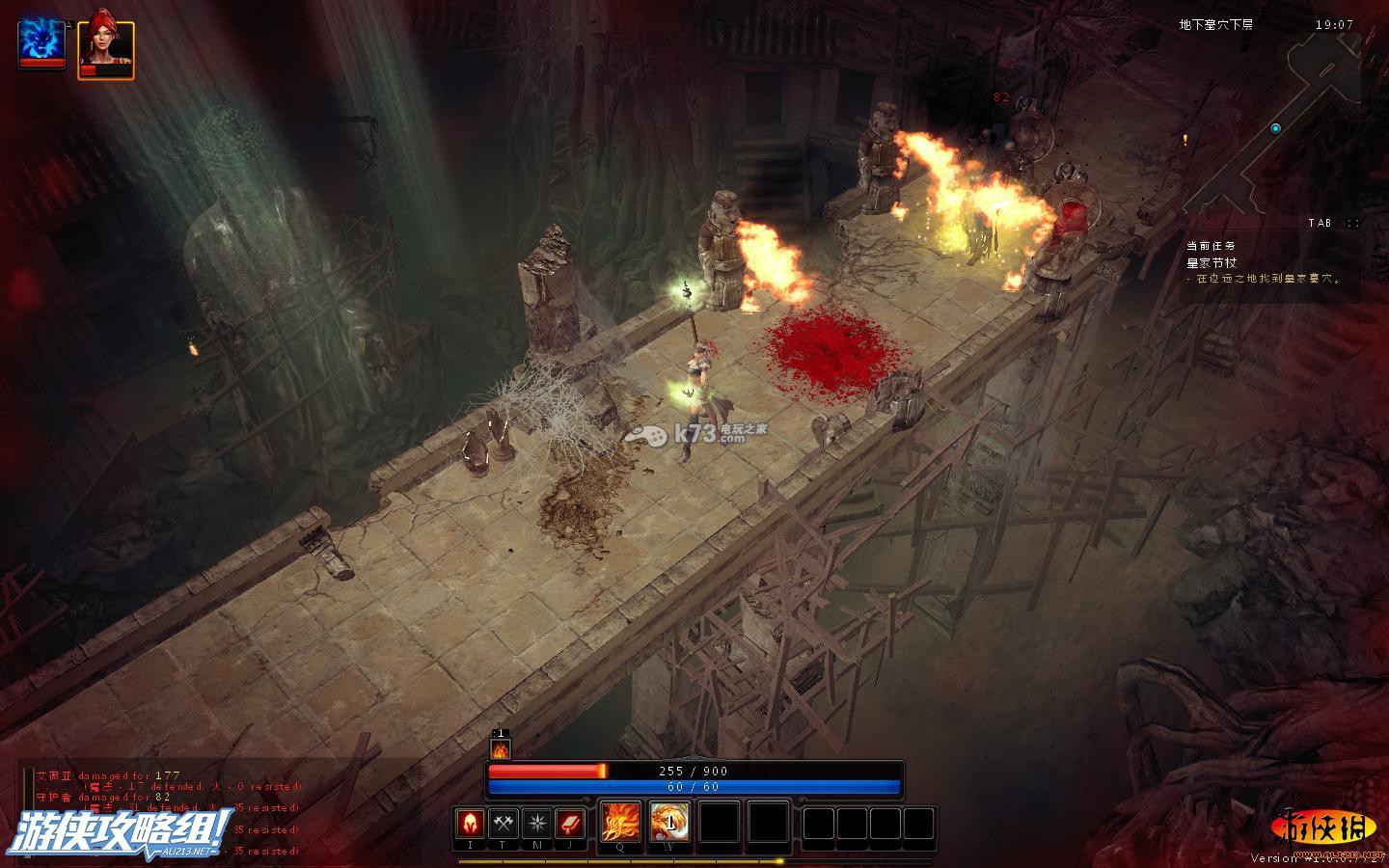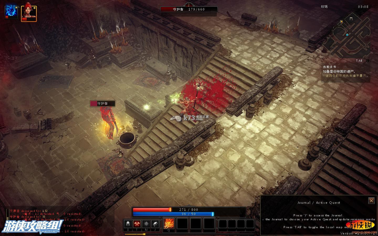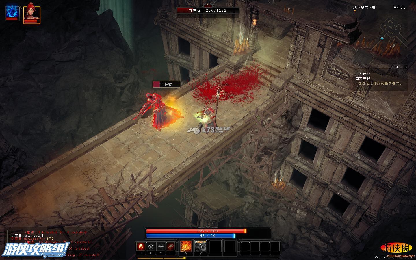 不得了,被打残了,这里需要注意的是守护者的远程攻击方式,地上形成个圈圈,若你在圈圈上,之后并会重伤你,因此,对付这种怪,只要巧妙的绕过守护者的圈圈。在适当的用我们自己的节奏攻击它就可消灭。