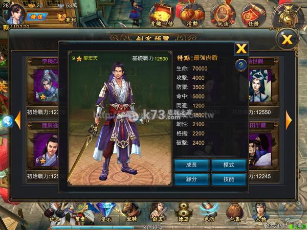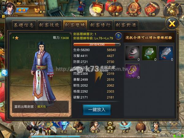 提醒玩家,建议先不用提升剑客的技能等级,因為提升技能要消耗真气,基本上真气光是用来提升主角技能都不够了,又怎麼能分神给别人呢~反正剑客最重要的工作就是防御,尽情地提高他的歷练等级,以及三不五时升一下『防守心法』,才是剑客的首要重点。