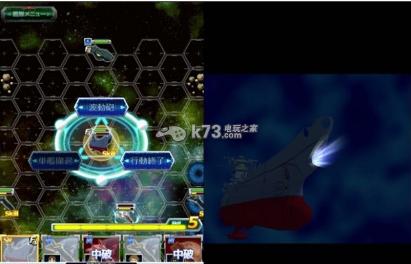 本作故事背景深厚,进入游戏后即为玩家展现出充满宇宙战争气息的界面和音乐。战斗场景和《机器人大战》类似,宇宙地图被划分为一个个六角形的小格子,每个舰队单位有一定的航行能力,玩家点击己方单位后即可移动,移动后如敌方在射程内,可以进入战斗阶段手动进行攻击。直接点击两次会出现发动技能(主舰大和号技能是超强力的地图武器——波动炮)、单舰撤退、行动结束选项。但需要注意的是每回合只可以对一个单位进行操作,若击破敌人则外加一次行动机会。