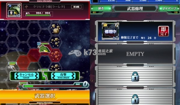 另外战斗结束后所消耗的能量和弹数不会自动补充,玩家必须在界面内点击补给选项消耗材料来修整自己的舰队,而材料会随着时间逐渐增加。因设置有耐久值,受到敌方攻击会出现武器、单位破损,此时也只能慢慢修理,设定上甚为真实。