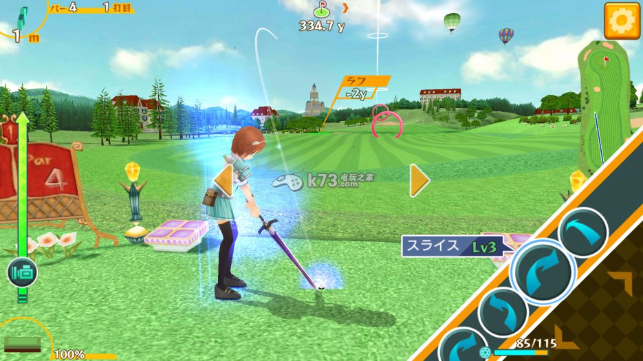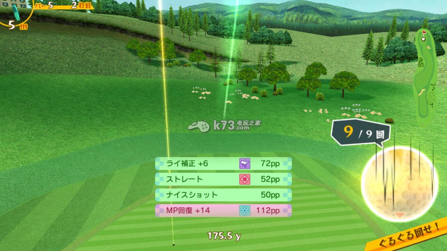 击出后的旋转控制,和魔法飞球会影响整个飞行路径的旋球不同,本作的旋球是从落地的瞬间才发挥作用,9 回以上的下旋球搭配铁桿使用可使球落地后的移动距离控制在 10y 之内,要安全上果岭是非常重要的,若是木桿搭配上旋球则能打出滚很远的长桿,停球距离与没有旋球的差距可以高达 50y 以上,是 Par5 的长洞必备,很可能在开球的滚动距离就影响了一桿的分数,要切球上果岭时若在飞行过程中发现偏左或偏右,也可以赶紧拉「左下」或「右下」来修正。