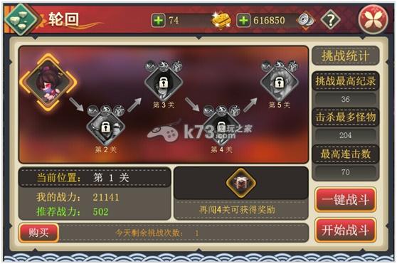 《妖刀物语》游戏中加入了轮回系统,此系统相当于我们经常体验到的爬塔系统,通过一个关卡之后就会解锁第二个关卡,而此系统也是我们获得银币与其它奖励的重要来源之地,不过却有着一天只能免费体验一次的机会。