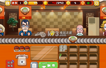 小编个人感觉《中华拉面馆》一定是开在日本唐人街上,为啥呢,因为到这家小店光顾的食客可都是日本动漫中的人物哦、他们都会以食客的身份来到小店中品尝各种口味的面条,他们的头顶上都有一个耐心度的指示条,如果他们等待时间越长指示条就会慢慢减少,从他们的表情上也能看出焦急程度(平和-焦虑-暴怒),直到减少到零,这位食客也会消。可是在游戏后期单子一多真心忙手忙脚忙,怎样才能挽留一下食客们呢?在食谱上方会有三块小蛋糕,它的作用就能让食客们的耐心度增加一些,但是只有三次机会哦。