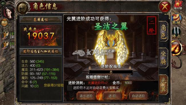 玩家战斗力到达3万后,将获得系统赠送的华丽光翼。对光翼进行进阶将大幅提升玩家的基础属性和战斗力,也将获得更加华丽的光翼造型。