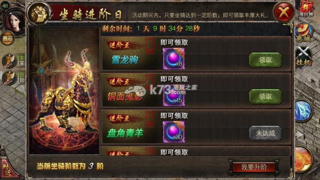 玩家战斗力到达5万后,将获得系统赠送的威猛坐骑,对坐骑进行进阶将大幅提升玩家的基础属性和战斗力。也将获得更加威猛的坐骑造型。