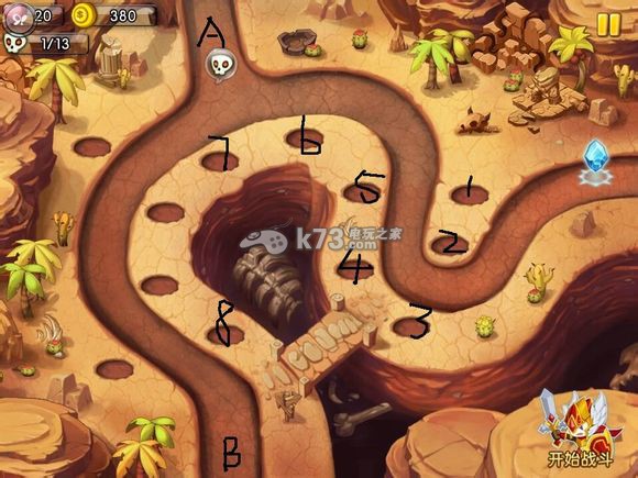 A先出怪,在1位放弓箭手,2位炮手,4位法师,5位防御塔,战士放在1245中间点,等待几波兵过后6位弓箭3位弓箭,随后B点差不多出怪了,怪是往上绕的,但是也要之后升级4位的法师,为后续做准备