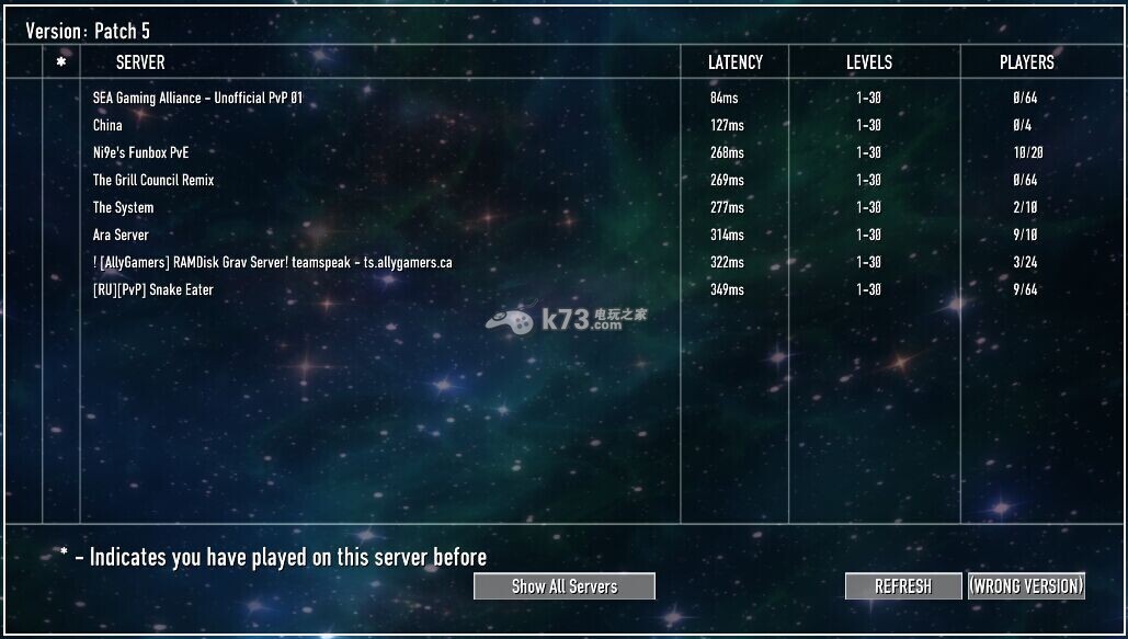 打开游戏后会显示所有的服务器列表,列表下方三个按键分别是:显示所有服务器,刷新服务器,和链接服务器(如果服务器和客户端版本不对显示的是版本错误)