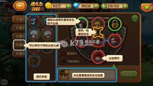当合击界面至少已上阵一个佣兵的情况下,系统同样会采用动态光效的形式,为小霸王们推荐可以激活合击条件的未上阵的佣兵。