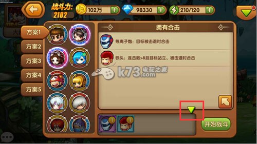 点击合击界面偏右下方的绿色箭头,可以弹出当前拥有合击的描述窗口。