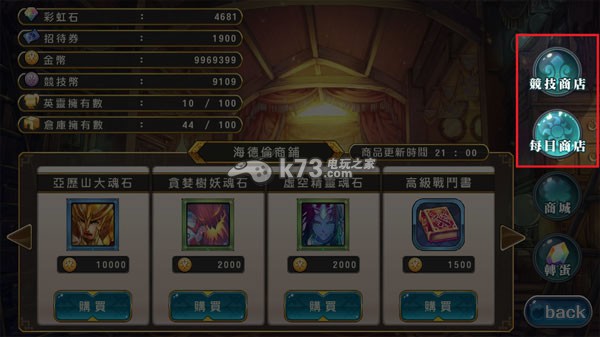 游戏商店共有两种,分别为每日商店与竞技商店,两个商店会贩卖不同种类的魂石与经验书,最大的差别就是购买东西所使用的货币有所不同。每日商店可以利用金币或者是彩虹石来购买物品,而竞技商店必须要透过完成竞技场的修练,拿到排名才能够取得每天所配发的排行奖励竞技币。