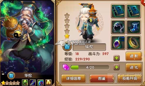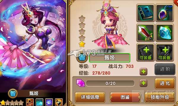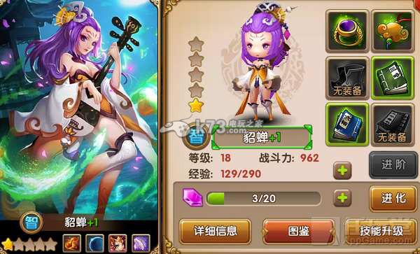 解说:貂蝉算是初始英雄里面最强悍的一位了。AOE群伤技能强悍,无论是推图还是过关斩将,她都称得上是pass神将。貂蝉升紫色之后,除了技能更犀利之外,能量的回复也更快。夸张点说,就是无限放大招。唯一的缺陷是竞技场并不适合貂蝉。