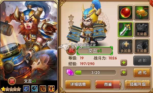 解说:文丑是玩家的第一位初始英雄。初始技能地崩,可以造成大范围的物理伤害和4秒的眩晕。升级之后的蓝色技能和紫色技能的伤害不高。平民玩家在前期没其他英雄可选,对文丑也就只好将就着用。他可控制,可防守。但是随着后面魏延、张飞的出现,文丑将逐渐被淘汰。平民玩家前期在竞技场大部分都需要一个具有控制技能的人物,这个时候可以推荐文丑来做前排。推图一般不推荐文丑上阵。
