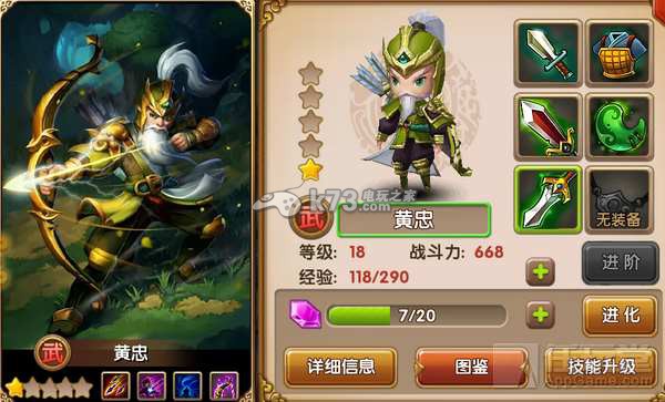 解说:黄忠的辅助技能在前期算是辅助英雄里面最鸡肋的。最大的优势在于升星容易,精英副本就可以获取将魂。黄忠升到紫色之后,技能逐步完善,在属于物理流的后期也是精兵强将一枚。