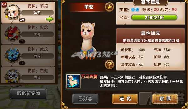 解说:这是初始的第一只宠物,长得还算比较萌。但是一群草泥马在屏幕上跑过的动画实在是不美观。技能需要在敌人挂了6个之后才能发动。而且一次战斗只能触发一次。前期基本可以不培养,到了后期,必然会得到其他的宠物。到时候再去培养宠物也不迟。