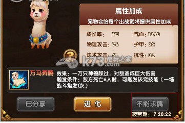 羊驼升级的同时是需要羊驼元神的,求偶可以获得元神。羊驼在兽栏中等待一段时间,点击收回,然后就可以在宠物页面求偶了。