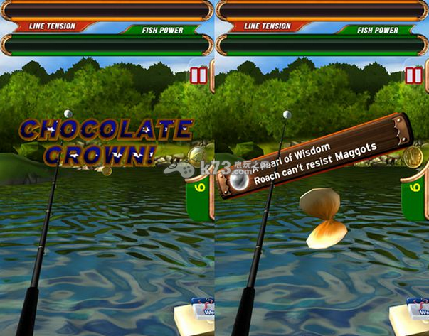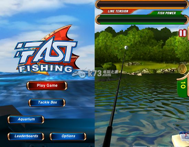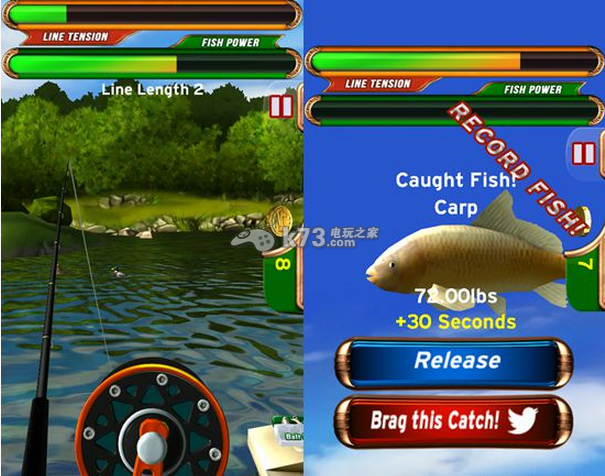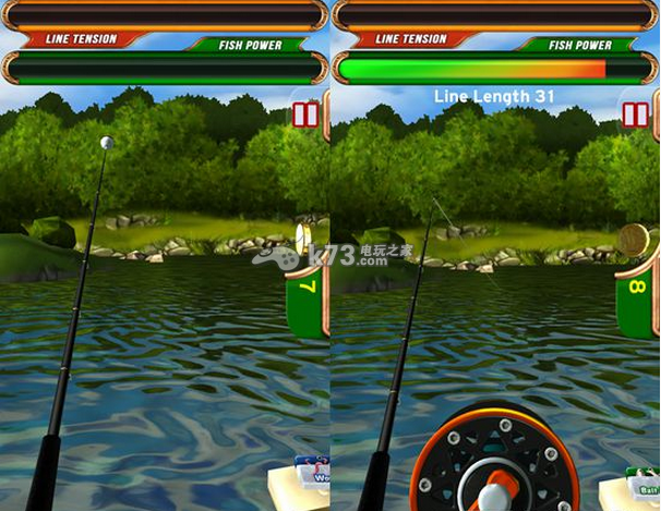 游戏采用了陀螺仪操作,玩家想要挥杆的时候只需要将手机模拟成鱼竿然后做出挥杆的动作,就可以把鱼钩给甩出去了。不过要注意幅度哦,轻轻用力便可以让鱼钩飞的很远,用力过猛反而容易让鱼钩掉落在身边的水域。鱼竿准备好了,那就可以等待鱼儿上钩了。当鱼儿上钩后,玩家可以转动屏幕下方的手把将鱼儿钓起,同时要注意上方的两个能力槽,鱼线耐久度(Line Tension)可以判断鱼的大小,而鱼挣扎的力度(Fish Power)则是捕获这条鱼可用的时间,如果是强大的鱼,那么只有收线比较快才可能钓得到它了。