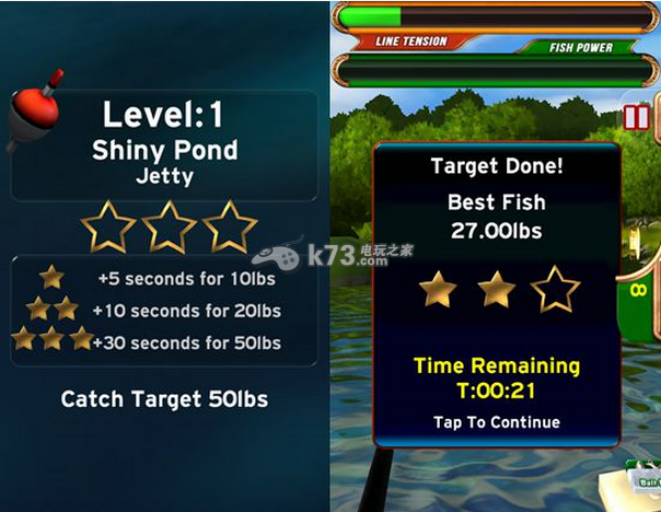 游戏的玩法十分简单,由于关卡采用的是星星作为评分标准,因此玩家可以从关卡开始前的列表中,观察到每个星星所要求的鱼儿大小总和数,玩家只需要在游戏限定时间内,钓出所要求的大小总和数便可以获得相应的星星。