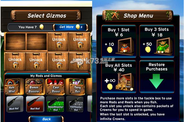 游戏中的工具箱(Tackle Box)可以查看玩家当前的钓具并对其进行更换,同时还可以用电子货币来购买金币,金币的作用在于可以丢进水里从而获得贝壳肉。