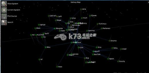 在星系图中把其中一点放大,可以看到附件的星系都有哪些,在星系之间穿越,必须Jump,这里笔者花了很长时间才研究出如何在两个星系间移动,如何Jump,其实,Jump的时候,会有一个提示Jump engine的状态:IDEL是表示空闲中;NotReady是表示不符合条件;Ready是表示可以Jump了。Jump的时候需要先在星系图中选定jump的目标,然后PlotCourse设定航线,然后再点击飞船,选择一个抛物线形状的icon就ok了(确保飞船里面必须在空间站中买了1个单位的反物质(AntiMatter),否则jump不了,每Jump一次消耗一个AntiMatter)