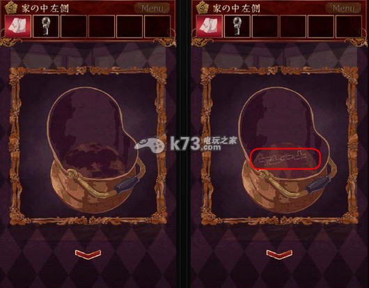 3、把灯泡装到第1步的那盏灯上,灯还是不亮,因为旁边的电闸没有打开,这时回到上一章节获得木炭的那个壶(还是桶?)那里,使用抹布,可以擦掉壶底的污渍,出现了四个“凸”字形样的图案,这就是电闸的密码啦,打开电闸,灯亮了。