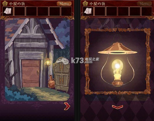 2、回到第一章的那个小木屋前,那里有一盏灯,但是灯泡太烫了,无法取下来,使用布这个道具,可以拿下灯泡。