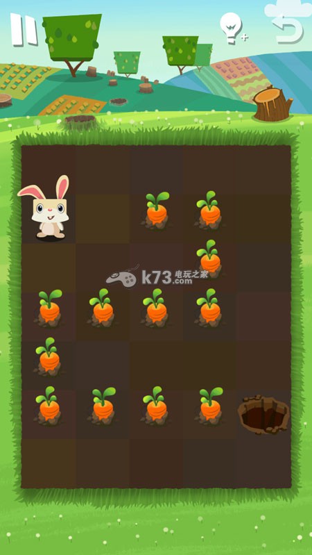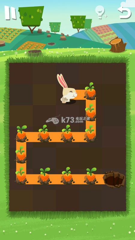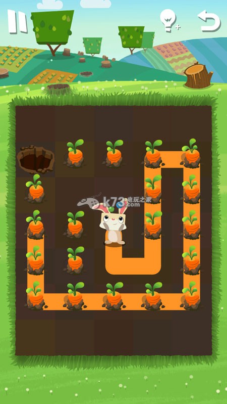 本作的玩法很简单,玩家要以小兔子为起点,用手指在关卡中画出一条路线,让小兔子既能吃掉所有萝卜又能顺势逃回地洞就可以了。但需要注意的是,玩家在画线时只能往横和竖两个方向画,而且还不能重复经过同一个萝卜,只有画出一条不重叠、不交叉的路线,才能帮助小兔子一次性将农田中的胡萝卜全部吃完。