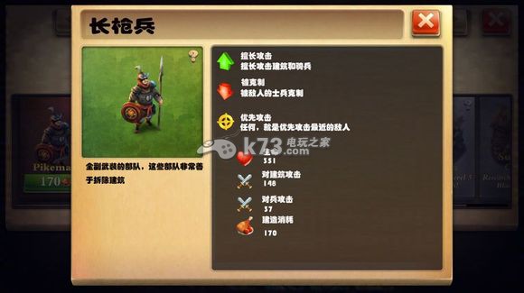 同时,长枪兵对骑兵有加层攻击,虽然不知道计算公式,但是确实一个长枪兵可以扛住一个骑兵并且取胜,初步怀疑骑兵护甲类型和建筑一样,所以用长枪兵的对建筑攻击计算。