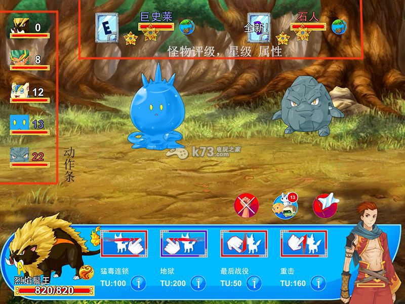可以看到,在动作条那一栏,怪物的头像旁边都有一个数值,这个数值是个时间值,大家看看我的怪物的技能释放消耗的是一个叫TU的数值,这并不是蓝条,也不是口袋常用的次数,而是个时间值,比如,我使用了地狱这个技能,消费了我200点TU,于是,我的动作条数值变成200,进入排序中