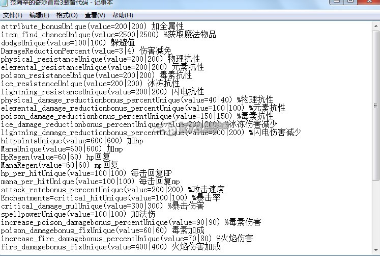 直接用记事本的方式打开修改文件里面的artifacts.cfg,直接搜索999即可找到护符的属性位置,后面value=999|999就是魔法物品的掉率了,直接根据本代码复制粘贴即可。