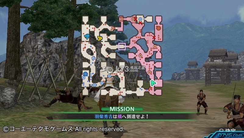 这时候系统又给任务,让你控制「羽柴秀吉」跑到桥那里,这个任务一定要用「方针设定」交给电脑去跑。毕竟电脑能跑路,但是不能打架嘛。你自己继续干4武将