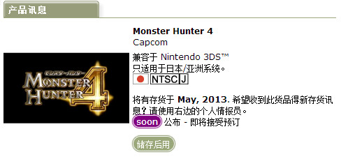 来自国外购物网站play-asia的消息称,其将会在今年5月得到《怪物猎人4》的存货,也就是说游戏可能会提前至5月发售,而非官方之前宣称的跳票至6月发售。...[查看全文]