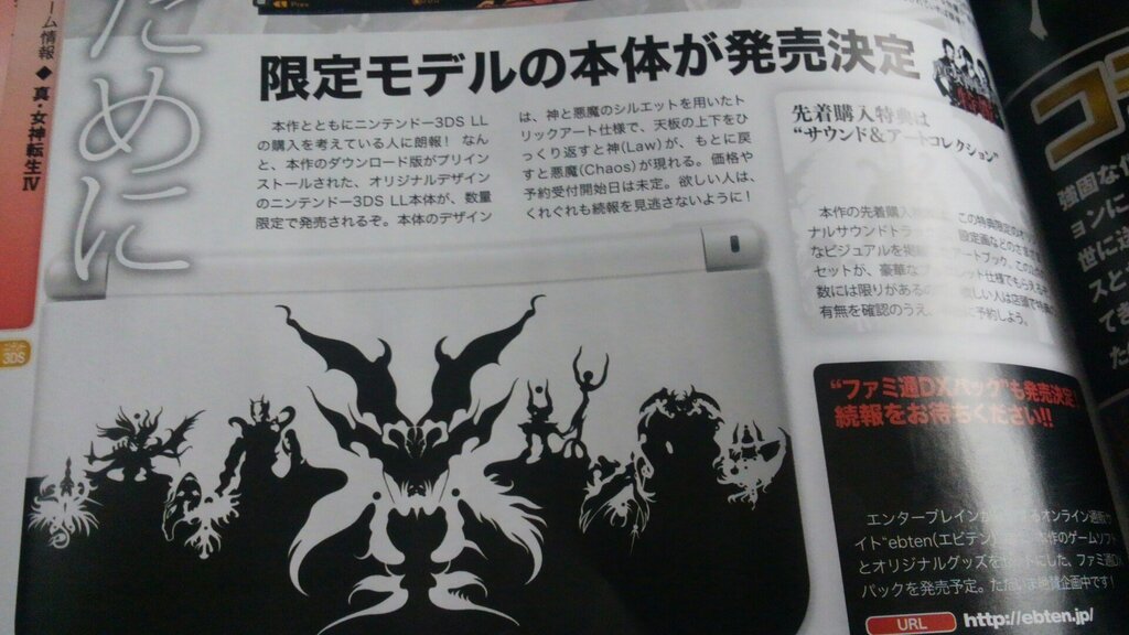 根据本周fami通杂志图的消息,将于3ds平台发售的角色扮演游戏《真女神转生4》的发售日期终于得到了判明。另外还得到公开的是游戏的发售价以及与游戏一同发售的限定主机的消息,本作的...[查看全文]