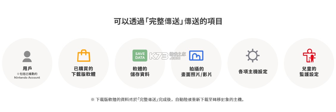 下载版游戏软件的资料将于「完整传送」完成后,自动陆续重新下载至转移对象的主机。
