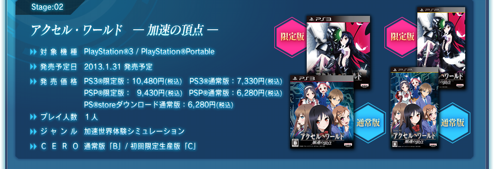 PSP/PS3游戏《加速世界 加速的顶点》是以今年春天改编为同名动画的轻小说《加速世界》作为基础的第二部游戏。预计2013年1月31日发售。