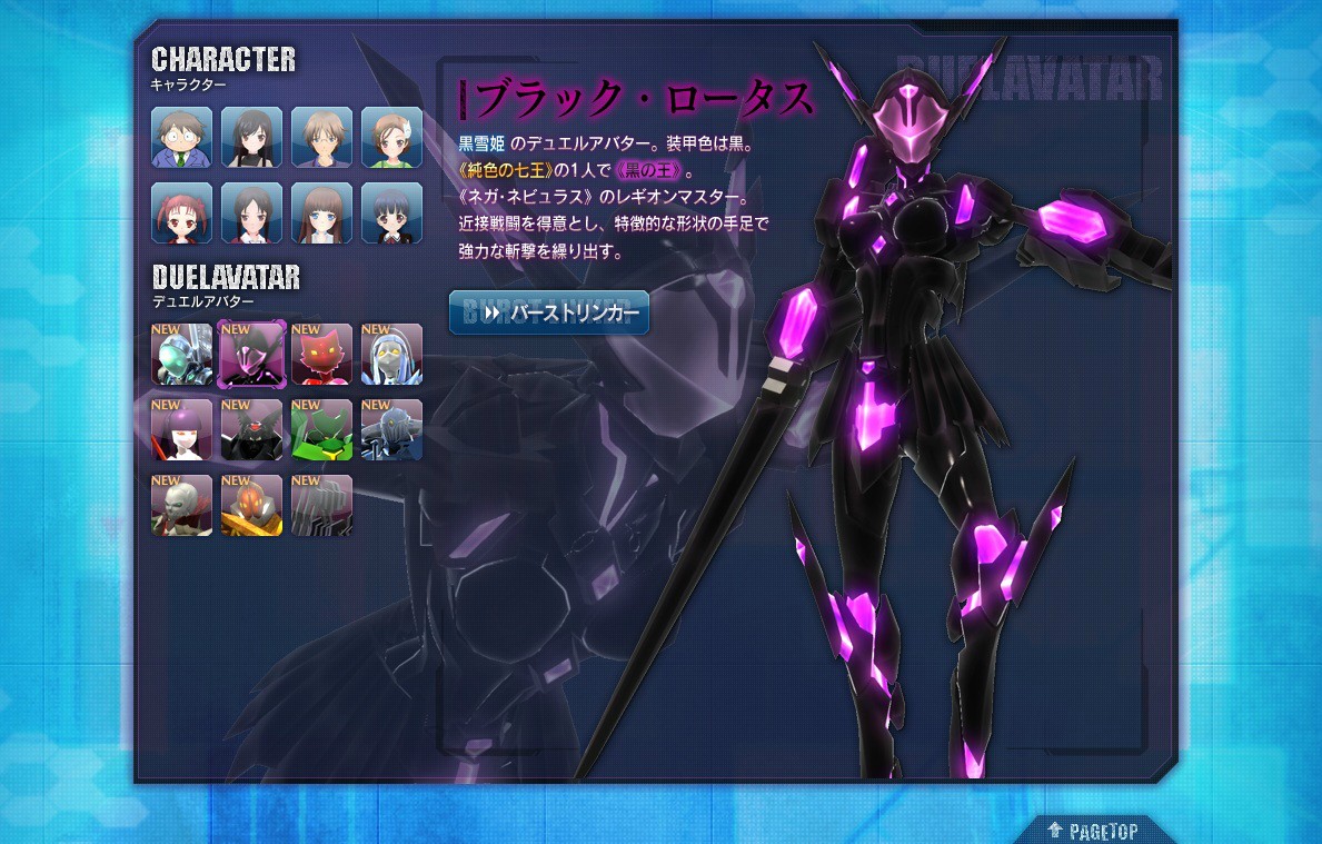 人物介绍的部分也新增了登场人物的假想体,图示为黑雪姬的假想体Black Lotus。