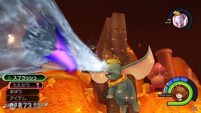 在空中坐在小飞象的身上进行移动,按△键还能发动喷水攻击「スプラッシュ」。