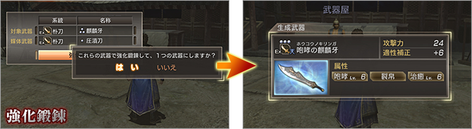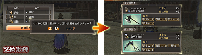 还有在将星模式可以于武器屋「锻鍊提升等级,能进行和对象武器相同系统的武器作为媒体使用的「强化锻鍊」和,用3个武器自由组合的做出新武器的「交换锻鍊」,能有效活用所持的武器。