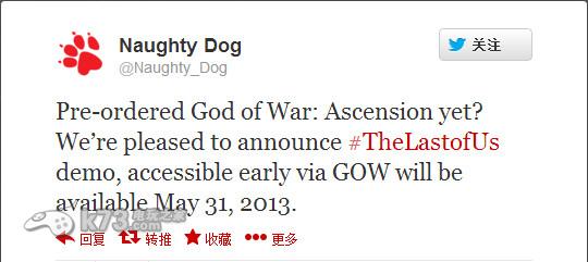 来自顽皮狗日前官方推特的消息称,其PS3独占大作《The Last of Us/末日余生》的试玩demo将会包含在即将发售的索尼第一方动作大作《战神升天》游戏中。