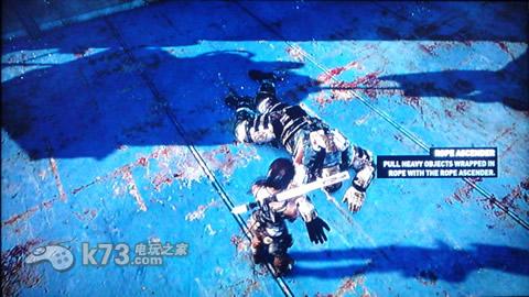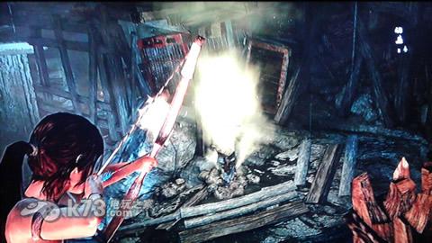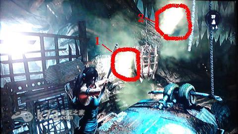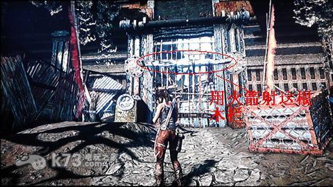 干掉后需要用火箭配合瓦斯炸下一个箱子,然后利用箱子爬上高处。之后利用火箭加瓦斯干掉一大堆敌人后到达下图处,先用弓箭绳索拉木板然后用火箭配瓦斯引爆。